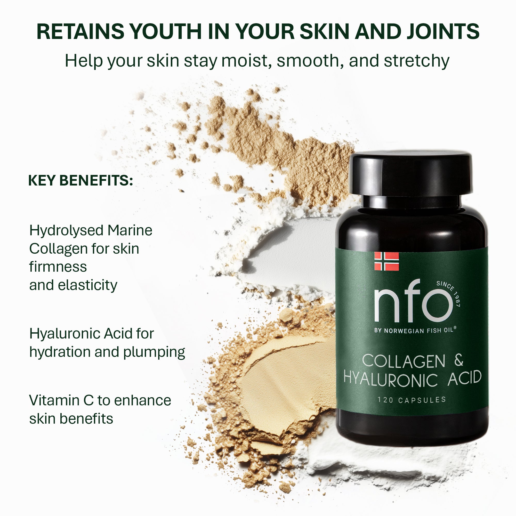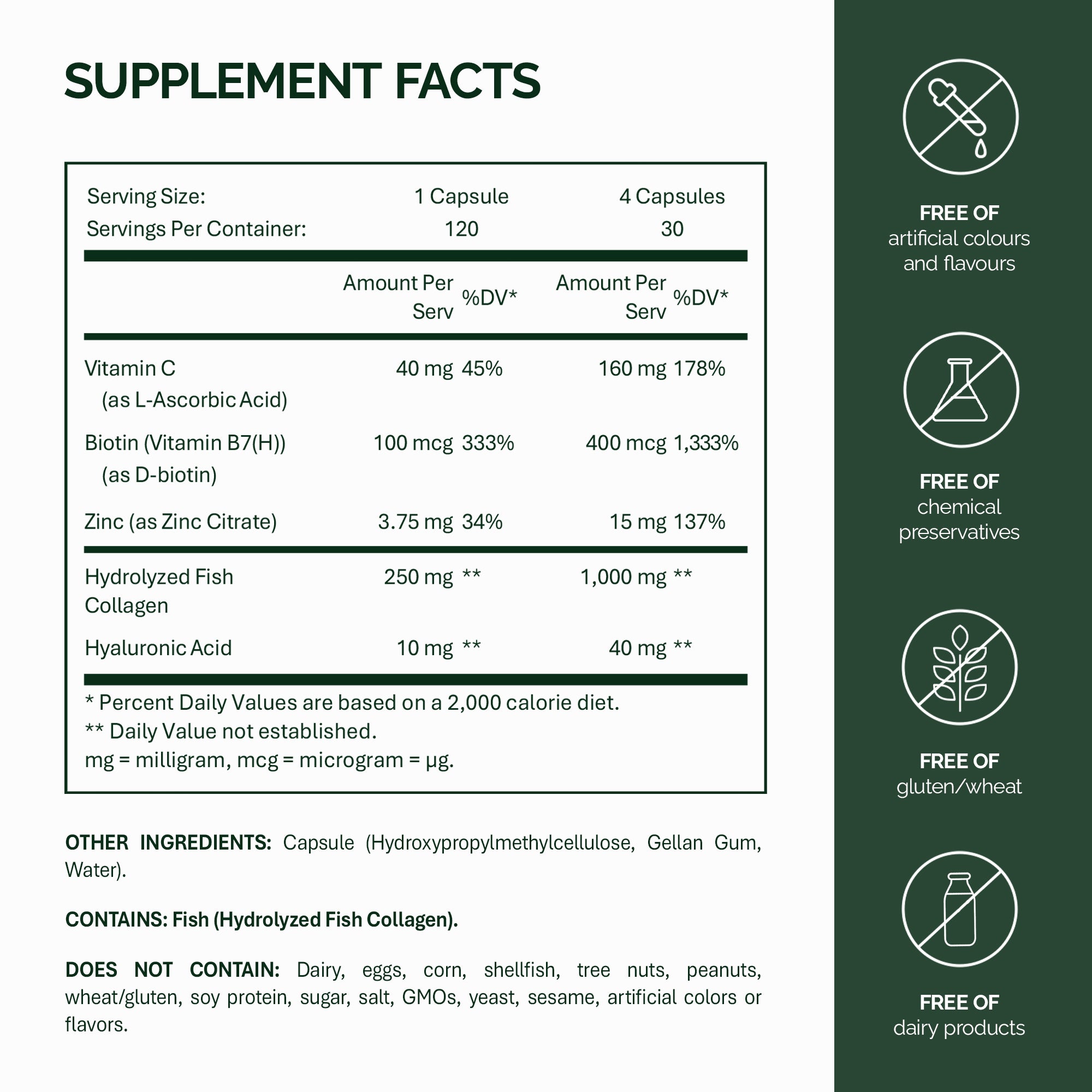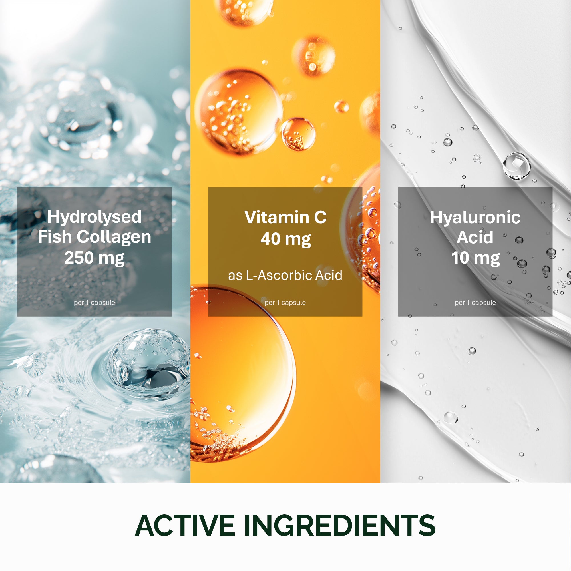 كولاجين + حمض الهيالورونيك = ثنائي الإشراقة والمرونة الخاص بك. هذه الكبسولة تدعم مرونة البشرة، الترطيب، وقوة الأظافر والشعر — يعني باختصار معزز الجمال الشامل لك.