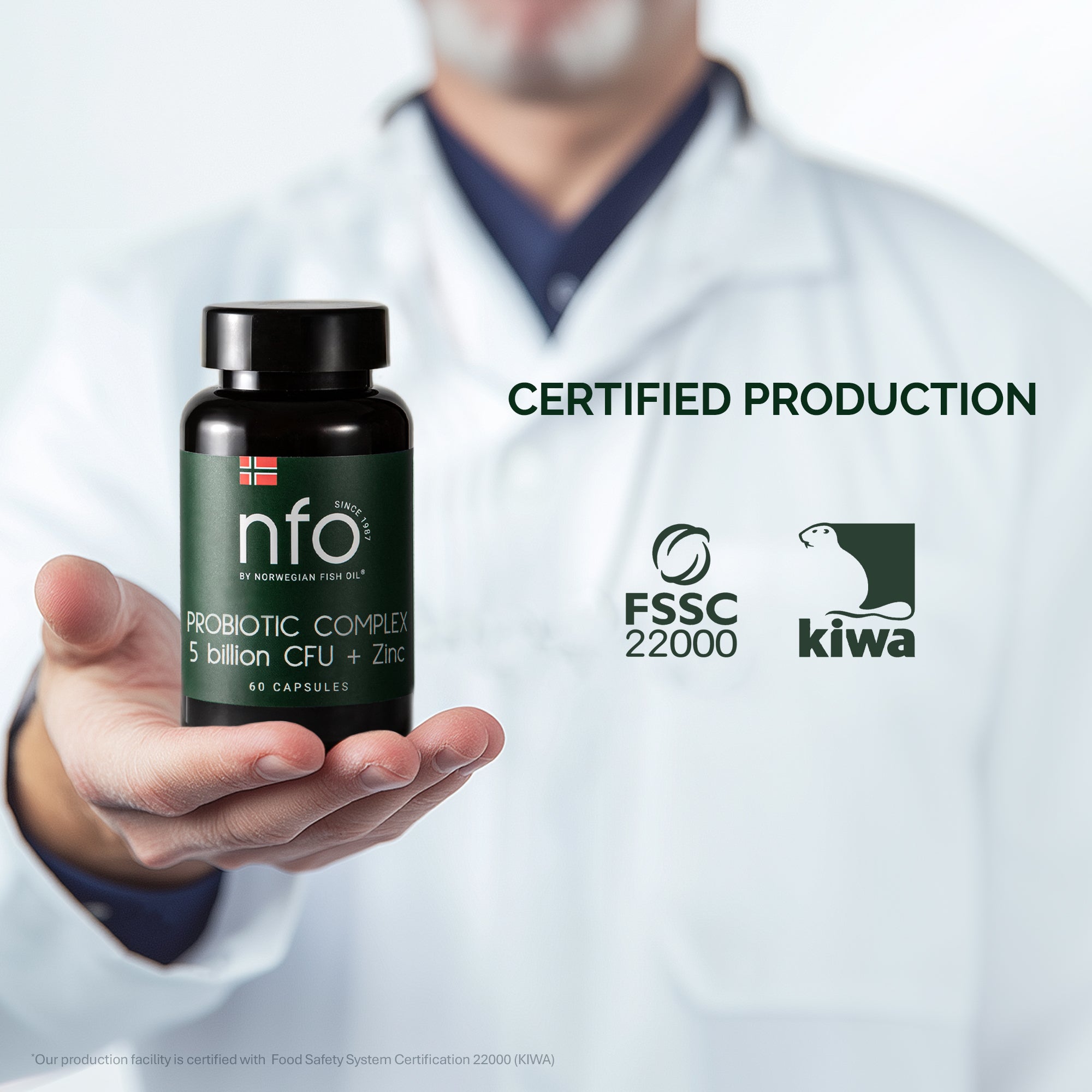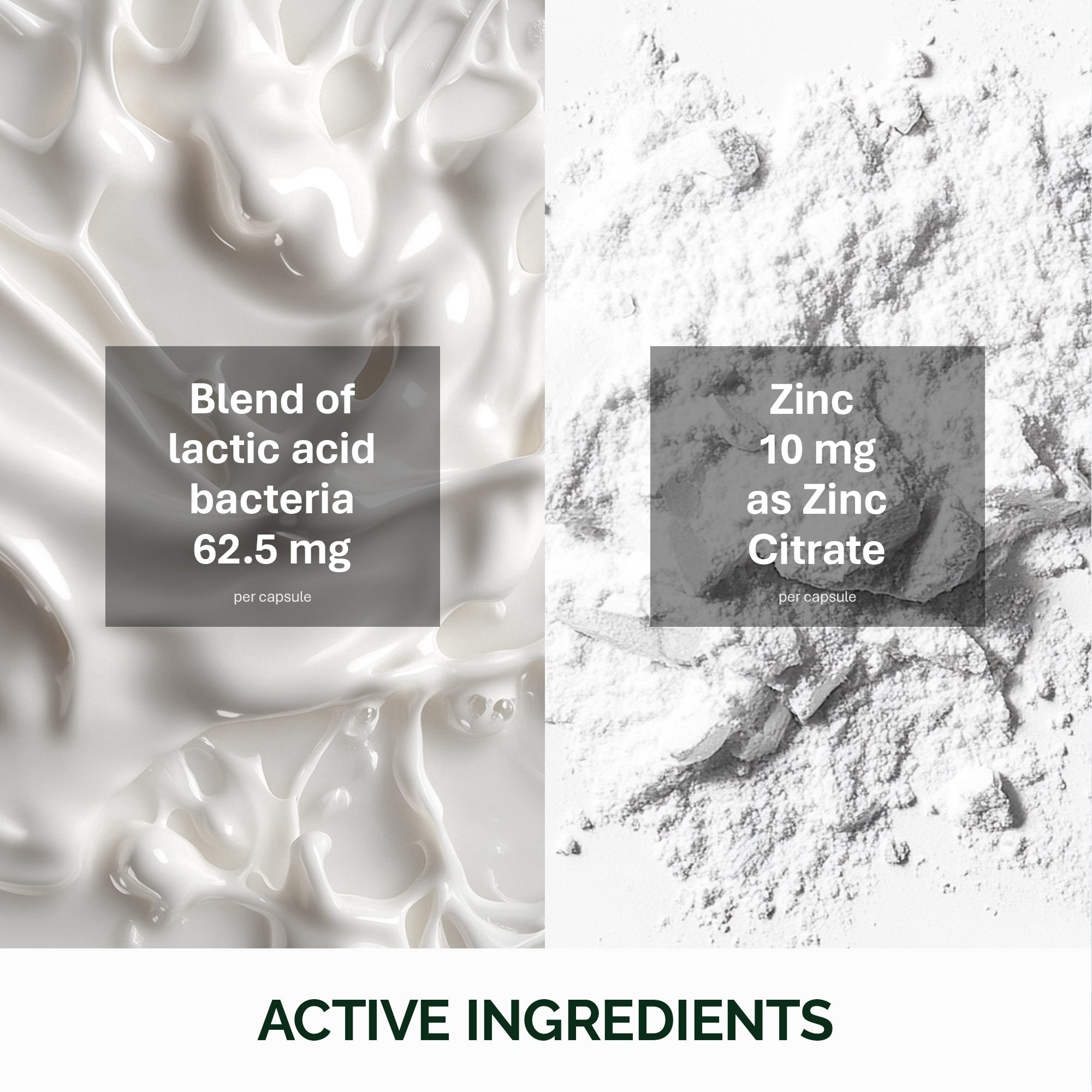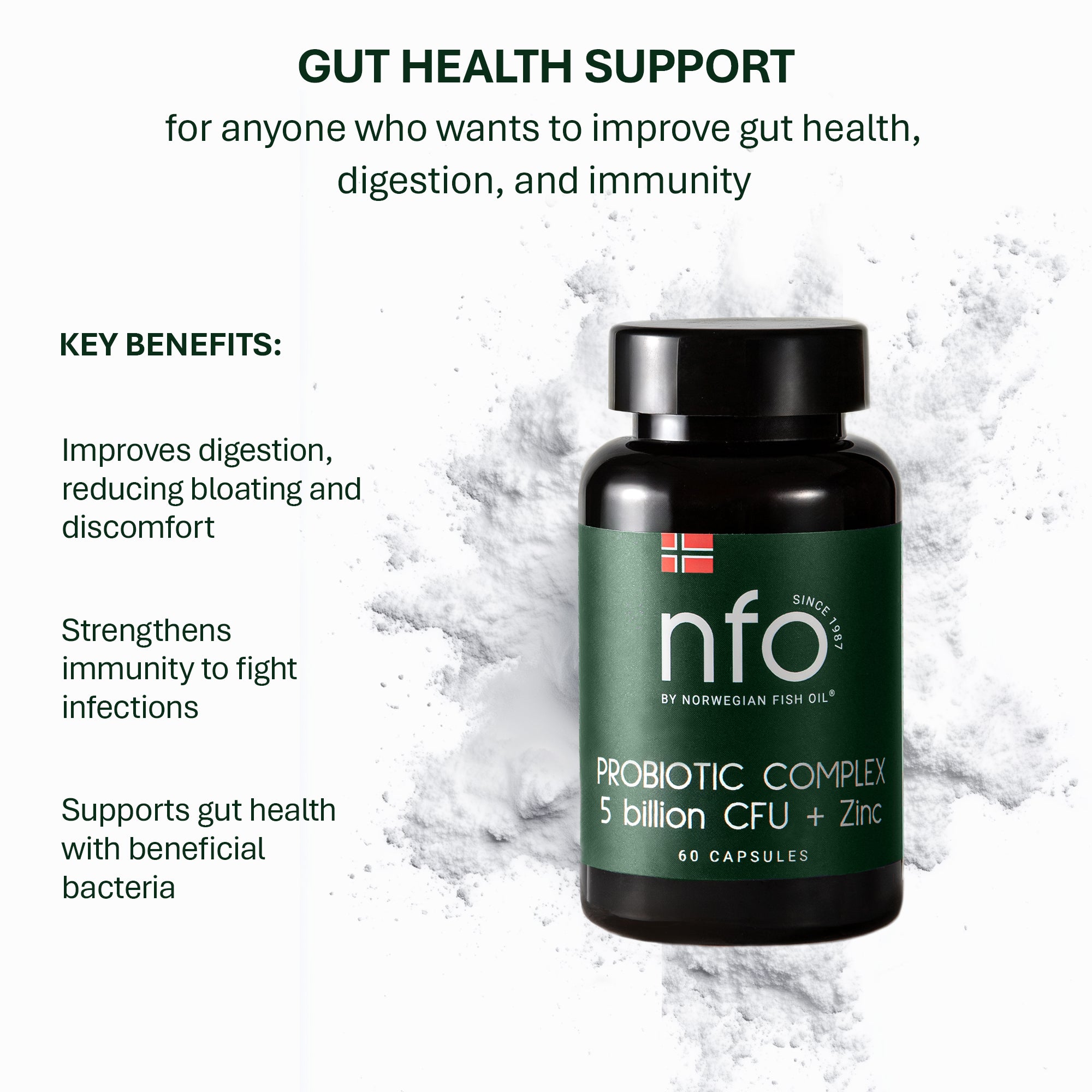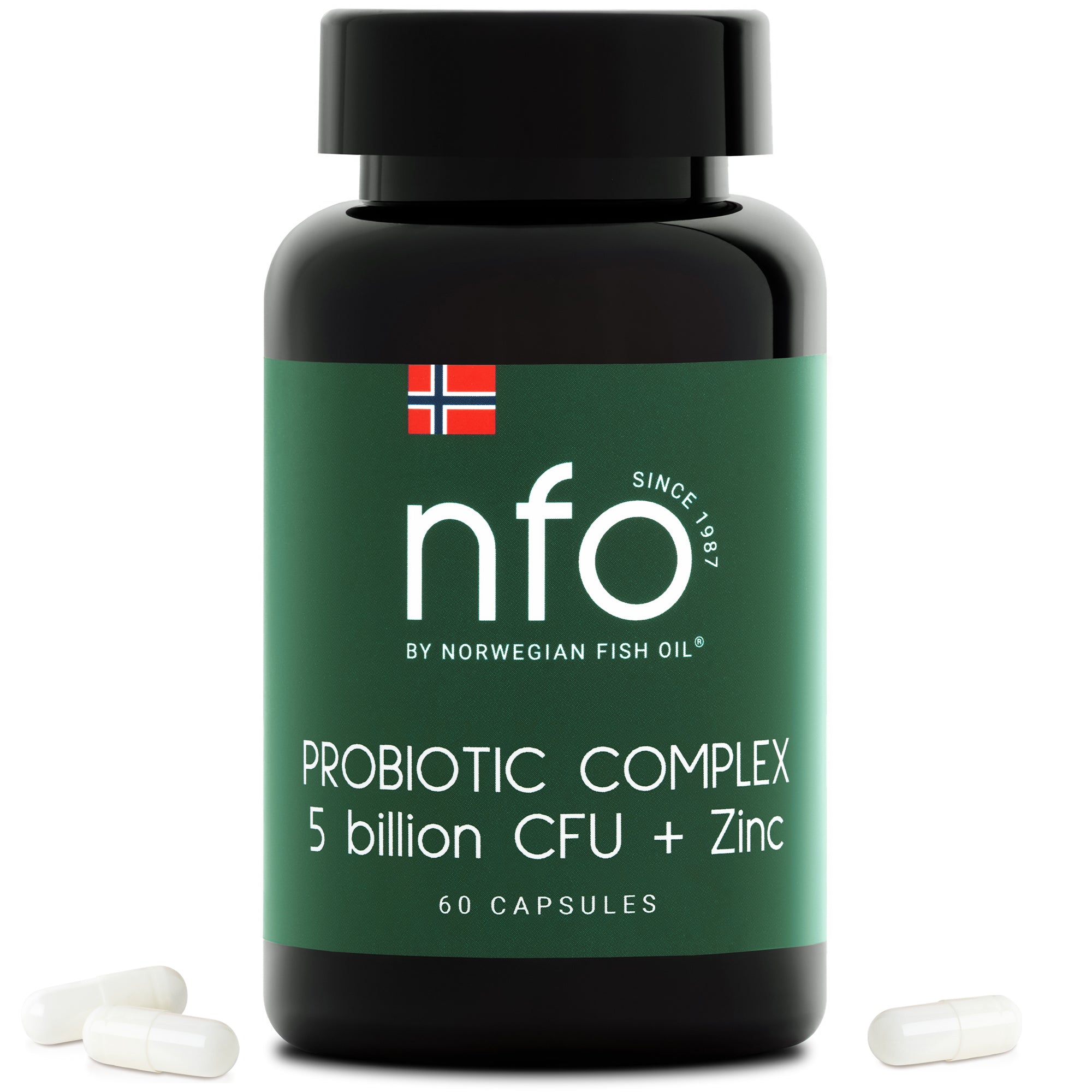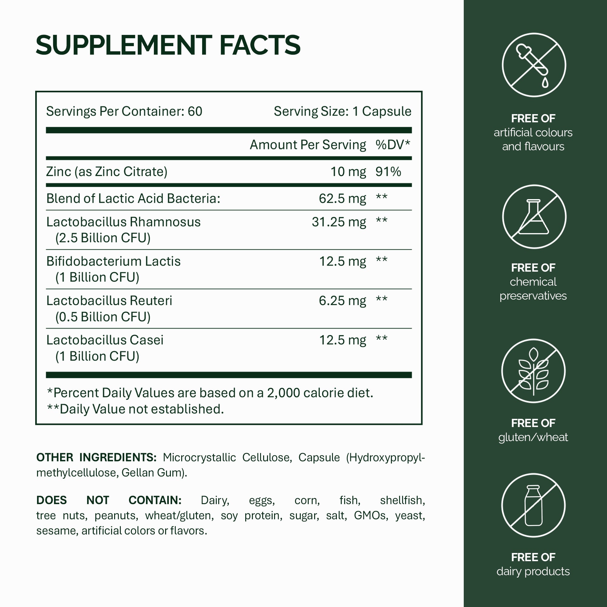Probiotic Complex = صحة الأمعاء في كبسولة وحدة. مع 5 مليار من البكتيريا الحية + الزنك، يخلي الهضم عندك سلس ويعطي جهازك المناعي دفعة يومية.