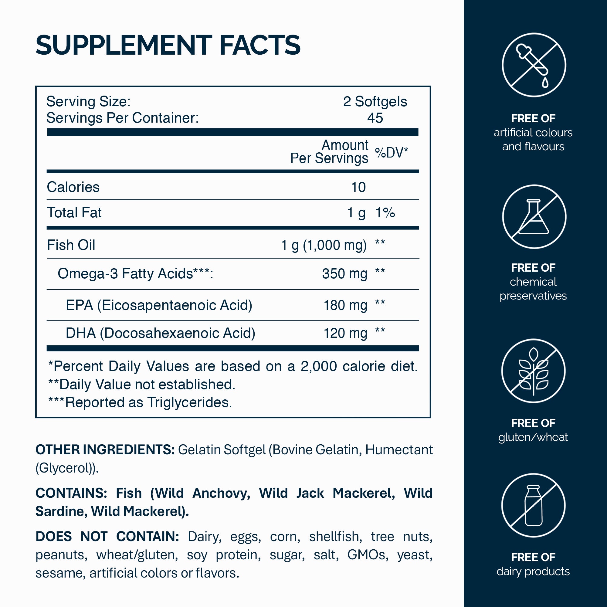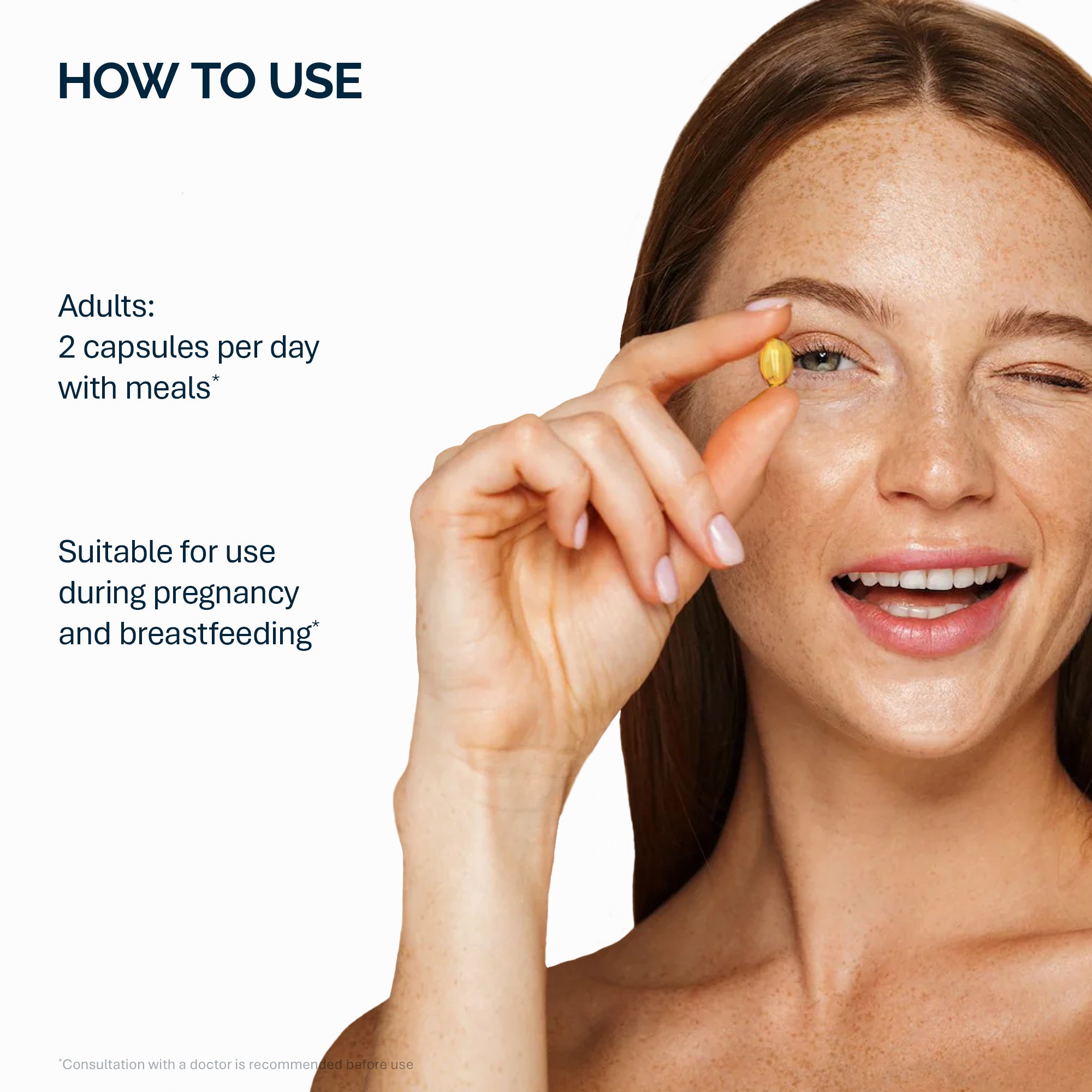 Omega-3 Balance = focus + heart health in 2 capsules. Small capsules for easy swallowing with pure fish oil rich in EPA & DHA, they sharpen your brain and keep your heart strong.